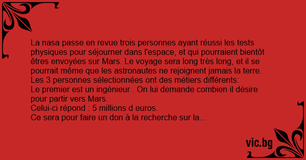 Le premier est un ingénieur . On lui demande combien il désire pour partir vers Mars.