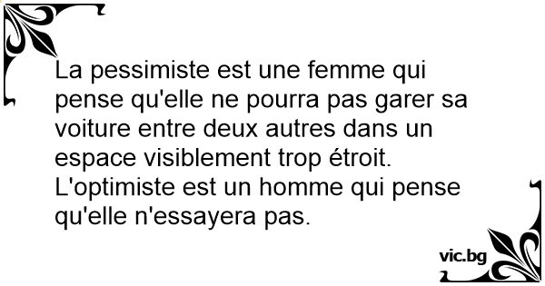 La pessimiste est une femme qui pense qu'elle ne pourra pas garer sa voiture entre deux autres dans un espace visiblement trop étroit. L'optimiste est un homme qui pense qu'elle n'essayera pas.