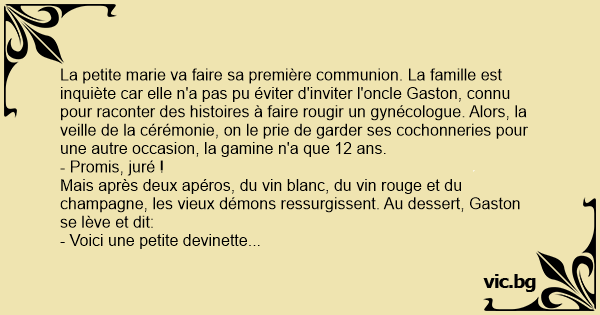 La petite marie va faire sa première communion. La famille est inquiète car elle n'a pas pu éviter d'inviter l'oncle Gaston, connu pour raconter des histoires à faire rougir un gynécologue. Alors, la veille de la cérémonie, on le prie de garder ses cochonneries pour une autre occasion, la gamine n'a que 12 ans.