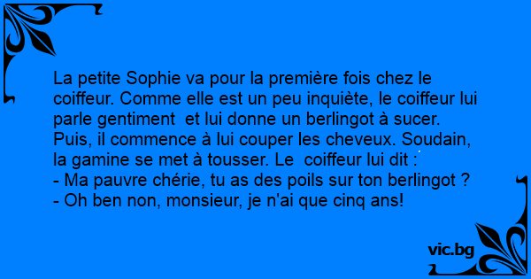 La petite Sophie va pour la première fois chez le coiffeur. Comme elle est un peu inquiète, le coiffeur lui parle gentiment et lui donne un berlingot à sucer. Puis, il commence à lui couper les cheveux. Soudain, la gamine se met à tousser. Le coiffeur lui dit :