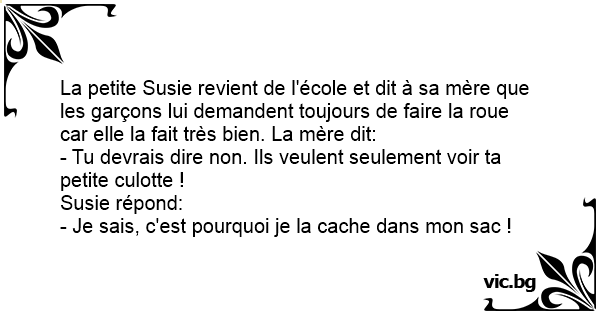 La petite Susie revient de l'école et dit à sa mère que les garçons lui demandent toujours de faire la roue car elle la fait très bien. La mère dit: