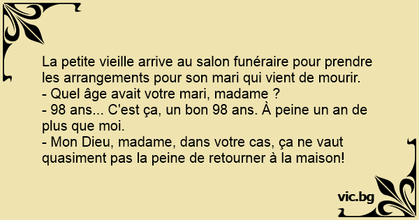 La petite vieille arrive au salon funéraire pour prendre les arrangements pour son mari qui vient de mourir.