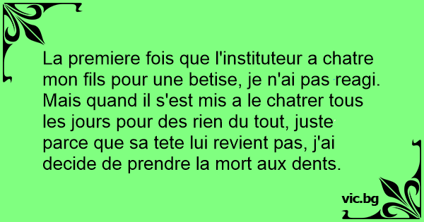La premiere fois que l'instituteur a chatre mon fils pour une betise, je n'ai pas reagi. Mais quand il s'est mis a le chatrer tous les jours pour des rien du tout, juste parce que sa tete lui revient pas, j'ai decide de prendre la mort aux dents.
