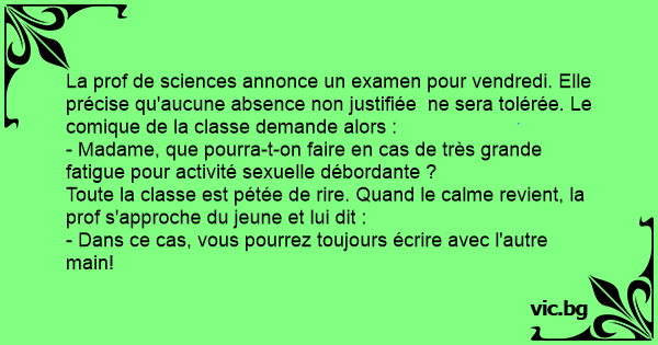 La prof de sciences annonce un examen pour vendredi. Elle précise qu'aucune absence non justifiée ne sera tolérée. Le comique de la classe demande alors :