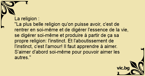 "La plus belle religion qu'on puisse avoir, c'est de rentrer en soi-même et de digérer l'essence de la vie, se digérer soi-même et produire à partir de ça sa propre religion: l'instinct. Et l'aboutissement de l'instinct, c'est l'amour! Il faut apprendre à aimer. S'aimer d'abord soi-même pour pouvoir aimer les autres."