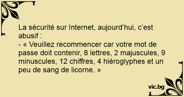 - « Veuillez recommencer car votre mot de passe doit contenir, 8 lettres, 2 majuscules, 9 minuscules, 12 chiffres, 4 hiéroglyphes et un peu de sang de licorne. »