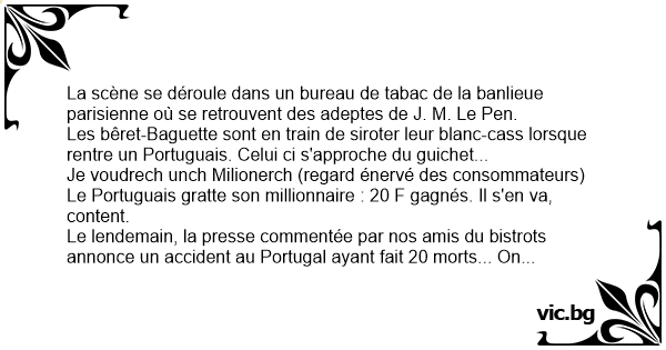 Les bêret-Baguette sont en train de siroter leur blanc-cass lorsque rentre un Portuguais. Celui ci s'approche du guichet...