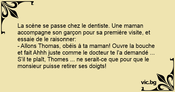 - Allons Thomas, obéis à ta maman! Ouvre la bouche et fait Ahhh juste comme le docteur te l'a demandé ... S'il te plaît, Thomes ... ne serait-ce que pour que le monsieur puisse retirer ses doigts!