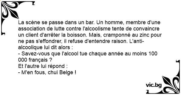 La scène se passe dans un bar. Un homme, membre d'une association de lutte contre l'alcoolisme tente de convaincre un client d'arrêter la boisson. Mais, cramponné au zinc pour ne pas s'effondrer, il refuse d'entendre raison. L'anti-alcoolique lui dit alors :