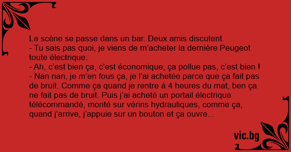 - Tu sais pas quoi, je viens de m’acheter la dernière Peugeot toute électrique.