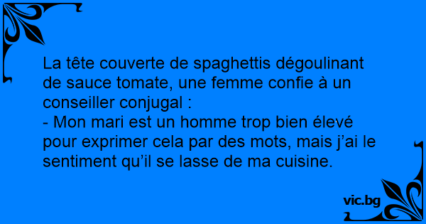 La tête couverte de spaghettis dégoulinant de sauce tomate, une femme confie à un conseiller conjugal :