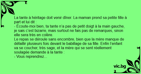 - Écoute-moi bien, ta tante n’a pas de petit doigt à la main gauche, je sais c’est bizarre, mais surtout ne fais pas de remarques, sinon elle sera très en colère.