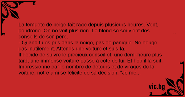 - Quand tu es pris dans la neige, pas de panique. Ne bouge pas inutilement. Attends une voiture et suis-la.