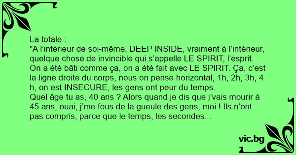 Quel âge tu as, 40 ans ? Alors quand je dis que j’vais mourir à 45 ans, ouai, j’me fous de la gueule des gens, moi ! Ils n’ont pas compris, parce que le temps, les secondes entre toi et moi sont des secondes mais pour l’oxygène qui est une matière moins compressée que ton corps humain ; 1 s’conde, c’est 100 secondes et la pierre et la brique et chais pas quoi, elle est faite de compression énorme.