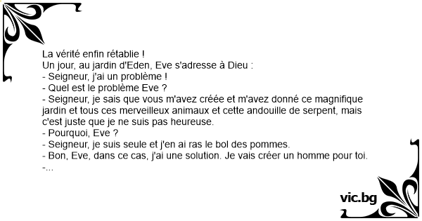 - Seigneur, je sais que vous m'avez créée et m'avez donné ce magnifique jardin et tous ces merveilleux animaux et cette andouille de serpent, mais c'est juste que je ne suis pas heureuse.