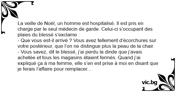 - Vous savez, dit le blessé, j’ai perdu la dinde que j’avais achetée et tous les magasins étaient fermés. Quand j’ai expliqué ça à ma femme, elle s’en est prise à moi en disant que je ferais l’affaire pour remplacer notre volaille pour le réveillon.