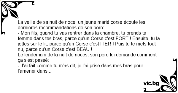 - Mon fils, quand tu vas rentrer dans la chambre, tu prends ta femme dans tes bras, parce qu'un Corse c'est FORT ! Ensuite, tu la jettes sur le lit, parce qu'un Corse c'est FIER ! Puis tu te mets tout nu, parce qu'un Corse c'est BEAU !