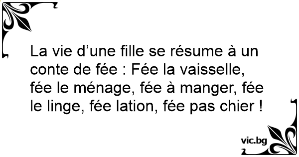 La vie d’une fille se résume à un conte de fée : Fée la vaisselle, fée le ménage, fée à manger, fée le linge, fée lation, fée pas chier !