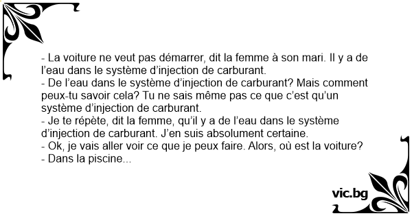 - La voiture ne veut pas démarrer, dit la femme à son mari. Il y a de l’eau dans le système d’injection de carburant.