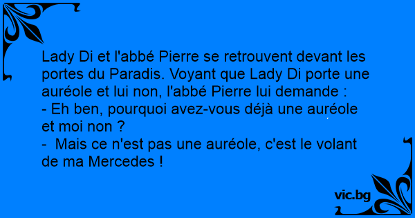 Lady Di et l'abbé Pierre se retrouvent devant les portes du Paradis. Voyant que Lady Di porte une auréole et lui non, l'abbé Pierre lui demande :