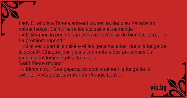 Lady Di et Mère Teresa arrivent toutes les deux au Paradis en même temps. Sаinт-Pierre les accueille et demande :