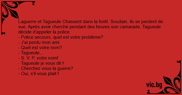 Laguerre et Tagueule Chassent dans la forêt. Soudain, ils se perdent de vue. Après avoir cherché pendant des heures son camarade, Tagueule décide d'appeler la police.