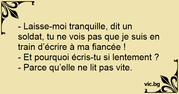 - Laisse-moi tranquille, dit un soldat, tu ne vois pas que je suis en train d’écrire à ma fiancée !