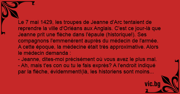 Le 7 mai 1429, les troupes de Jeanne d'Arc tentaient de reprendre la ville d'Orléans aux Anglais. C'est ce jour-là que Jeanne prit une flèche dans l'épaule (historique!). Ses compagnons l'emmenèrent auprès du médecin de l'armée.