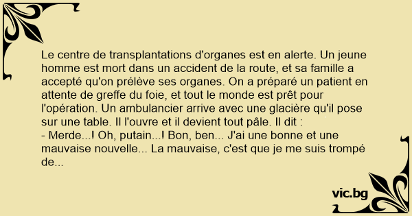 Le centre de transplantations d'organes est en alerte. Un jeune homme est mort dans un accident de la route, et sa famille a accepté qu'on prélève ses organes. On a préparé un patient en attente de greffe du foie, et tout le monde est prêt pour l'opération. Un ambulancier arrive avec une glacière qu'il pose sur une table. Il l'ouvre et il devient tout pâle. Il dit :