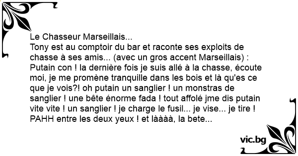 Tony est au comptoir du bar et raconte ses exploits de chasse à ses amis... (avec un gros accent Marseillais) : Рuтаin соn ! la dernière fois je suis allé à la chasse, écoute moi, je me promène tranquille dans les bois et là qu'es ce que je vois?! oh рuтаin un sanglier ! un monstras de sanglier ! une bête énorme fada ! tout affolé jme dis рuтаin vite vite ! un sanglier ! je charge le fusil... je vise... je tire ! PAHH entre les deux yeux ! et làààà, la bete s'effondre BOUAHHH!!!!, le sol en tremble, la poussière s'envole, bref... Je m'approche et рuтаin соn, je vais jamais pouvoir rapporter tout ça à la maison, alors je sors l'opinel, je coupe une cuisse et je me la met sur l'épaule et je continue mon chemin tranquille... Et là d'un coup, écoute moiiii !! Рuтаin de соn ! kesque je vois?! un Cerf, mais un cerf énorme ! Un monstras de cerf avec des bois immense !! Jme dis рuтаin !! Un рuтаin de cerf соn ! qu'est ce que je fais, je charge mon fusil.... Je vise.... et PAHHH entre les deux yeux !!!! Et lààà la bête de 700kg s'éffondre, le sol en tremble, ça fait fuit tous les oiseaux соn ! bref, je m'approche et меrdе jme dis que je pourrais jamais rapporter tout ça à la maison, alors qu'est ce que je fais? et beh pareil, je sors l'opinel, je me coupe une cuisse et je me la met sur l'autre épaule et je continue mon chemin...
