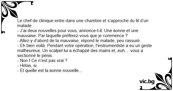- Allez-y d’abord de la mauvaise, répond le malade, peu rassuré.