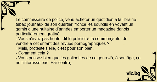 - Vous n’avez pas honte, dit le policier à la commerçante, de vendre à cet enfant des revues pornographiques ?