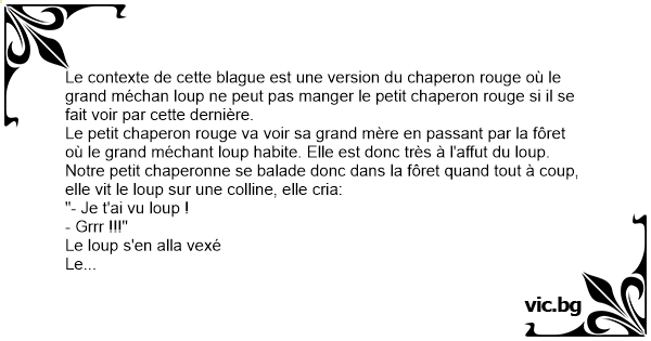 Le contexte de cette blague est une version du chaperon rouge où le grand méchan loup ne peut pas manger le petit chaperon rouge si il se fait voir par cette dernière.