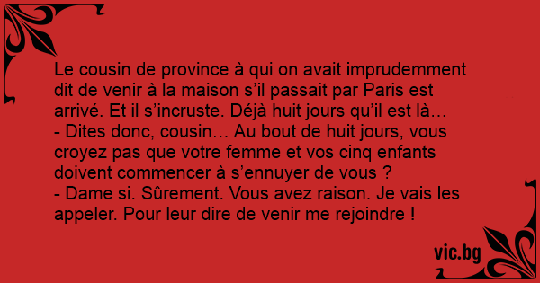 - Dites donc, cousin… Au bout de huit jours, vous croyez pas que votre femme et vos cinq enfants doivent commencer à s’ennuyer de vous ?