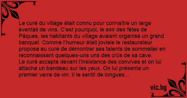 Le curé du village était connu pour connaître un large éventail de vins. C’est pourquoi, le soir des fêtes de Pâques, les habitants du village avaient organisé un grand banquet. Comme l’humeur était joviale le restaurateur proposa au curé de démontrer ses talents de sommelier en reconnaissant quelques-uns uns des crûs de sa cave.