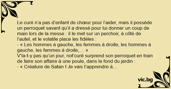 V’la-t-y pas qu’un jour, not’curé surprend son perroquet en train de faire son affaire à une poule, dans le fond du jardin :