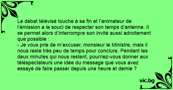 Le débat télévisé touche à sa fin et l’animateur de l’émission a le souci de respecter son temps d’antenne. Il se permet alors d’interrompre son invité aussi adroitement que possible :