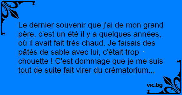 Le dernier souvenir que j'ai de mon grand père, c'est un été il y a quelques années, où il avait fait très chaud. Je faisais des pâtés de sable avec lui, c'était trop chouette ! C'est dommage que je me suis tout de suite fait virer du crématorium...