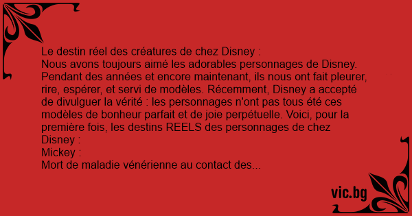 Nous avons toujours aimé les adorables personnages de Disney. Pendant des années et encore maintenant, ils nous ont fait pleurer, rire, espérer, et servi de modèles. Récemment, Disney a accepté de divulguer la vérité : les personnages n'ont pas tous été ces modèles de bonheur parfait et de joie perpétuelle. Voici, pour la première fois, les destins REELS des personnages de chez Disney :