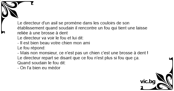 Le directeur d'un asil se promène dans les couloirs de son établissement quand soudain il rencontre un fou qui tient une laisse reliée à une brosse à dent