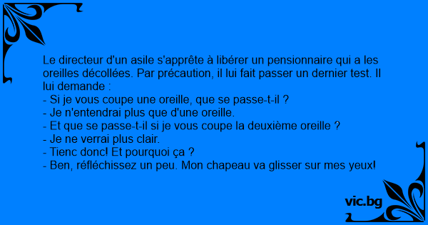 Le directeur d'un asile s'apprête à libérer un pensionnaire qui a les oreilles décollées. Par précaution, il lui fait passer un dernier test. Il lui demande :