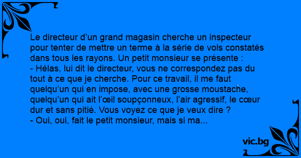 - Hélas, lui dit le directeur, vous ne correspondez pas du tout à ce que je cherche. Pour ce travail, il me faut quelqu’un qui en impose, avec une grosse moustache, quelqu’un qui ait l’œil soupçonneux, l’air agressif, le cœur dur et sans pitié. Vous voyez ce que je veux dire ?