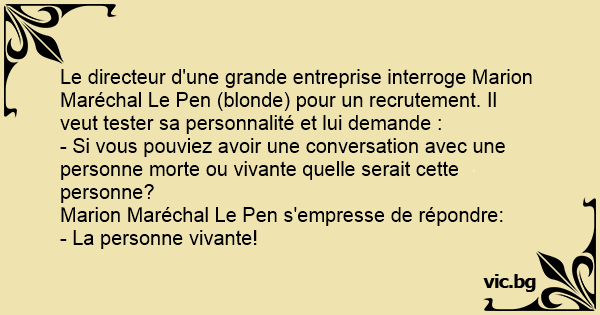 Le directeur d'une grande entreprise interroge Marion Maréchal Le Pen (blonde) pour un recrutement. Il veut tester sa personnalité et lui demande :