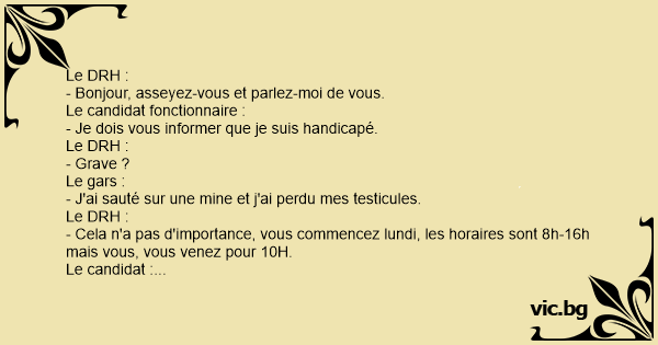 C'est l'histoire du personne qui veut se faire embaucher aux services des impôts.A la fin de son entretien il dit à son futur patron : "Vous savez monsieur je ne sais pas si c'est grave mais pendant la guerre j'ai perdu une testicule. -Oh mais ne vous inquiétez pas du coup venez demain à 11h -Oh...