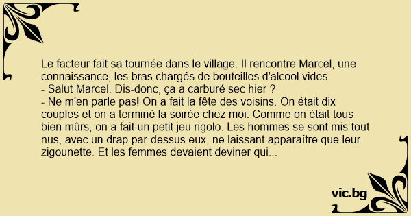 Le facteur fait sa tournée dans le village. Il rencontre Marcel, une connaissance, les bras chargés de bouteilles d'alcool vides.