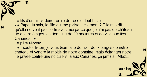 - « Papa, tu sais, la fille qui me plaisait tellement ? Elle m’a dit qu’elle ne veut pas sortir avec moi parce que je n’ai pas de château de quatre étages, de domaine de 20 hectares et de villa aux îles Canaries ! »