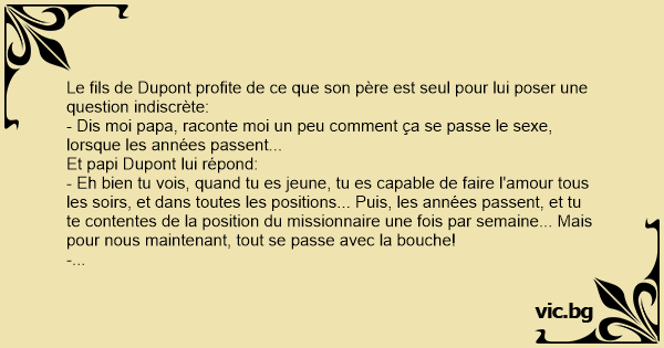 - Eh bien tu vois, quand tu es jeune, tu es capable de faire l'amour tous les soirs, et dans toutes les positions... Puis, les années passent, et tu te contentes de la position du missionnaire une fois par semaine... Mais pour nous maintenant, tout se passe avec la bouche!
