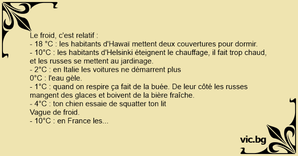 - 20°C A görögök felveszik a pulóverüket (ha megtalálják azt) - 15°C A jamaicaiak bekapcsolják a fűtést (persze, ha van nekik). - 10°C Az amerikaiak reszketnek a hidegtől. Az oroszok a kiskertekben...
