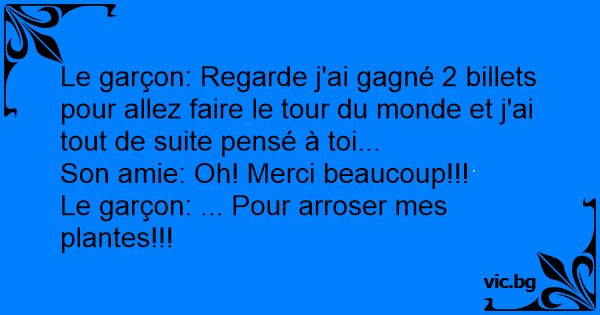 Le garçon: Regarde j'ai gagné 2 billets pour allez faire le tour du monde et j'ai tout de suite pensé à toi...