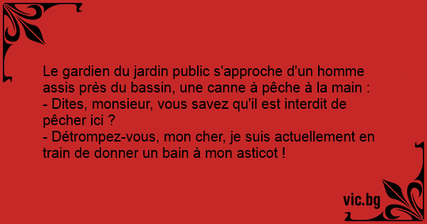 Le gardien du jardin public s'approche d'un homme assis près du bassin, une canne à pêche à la main :
